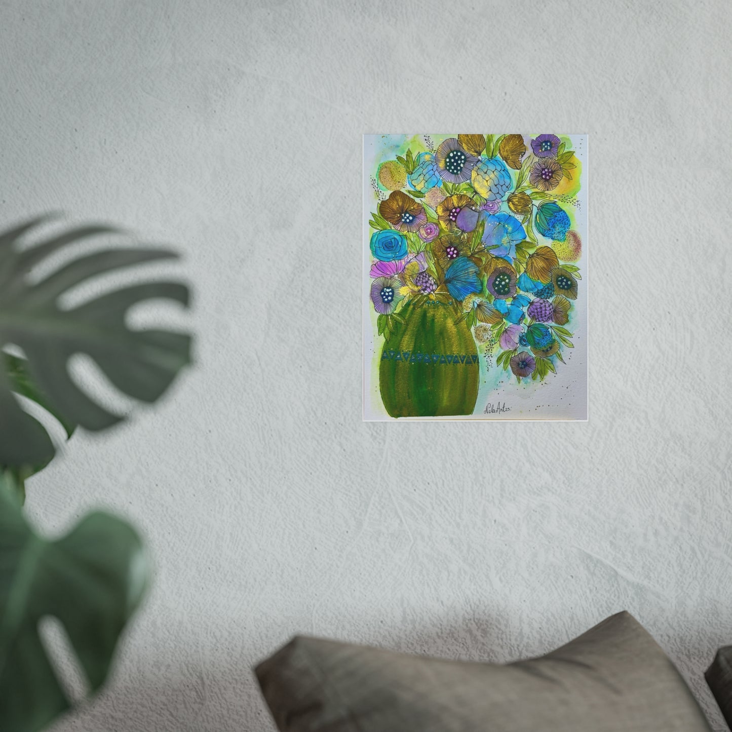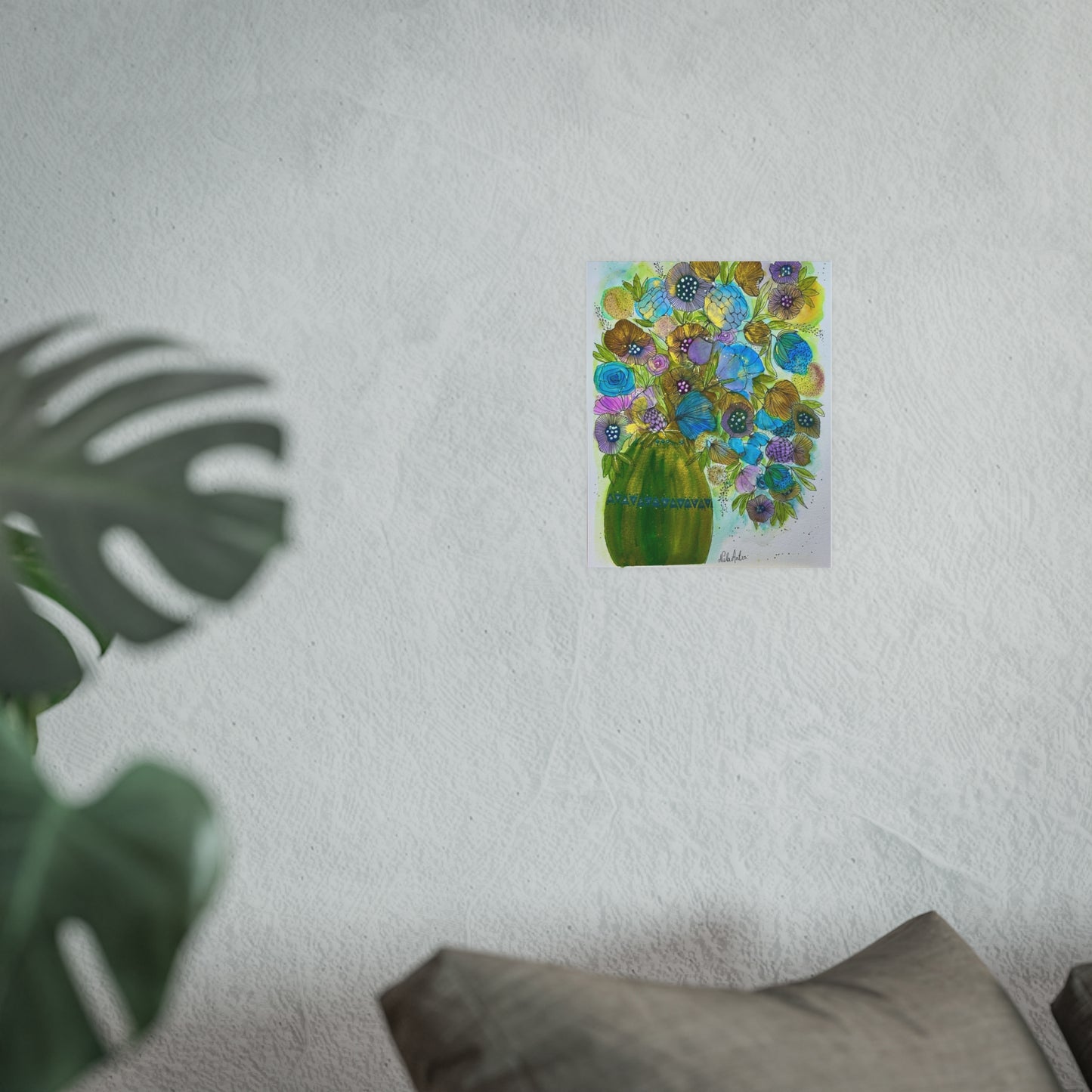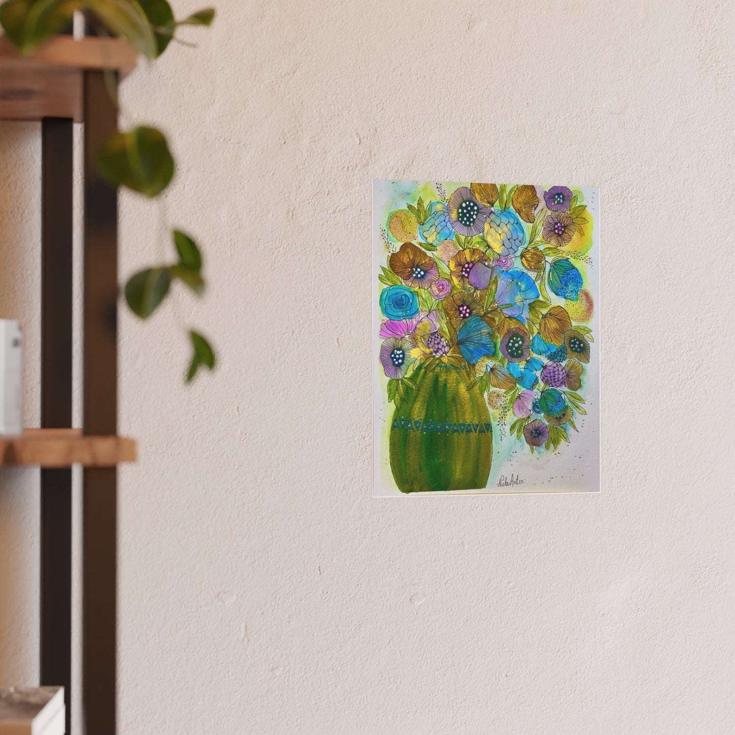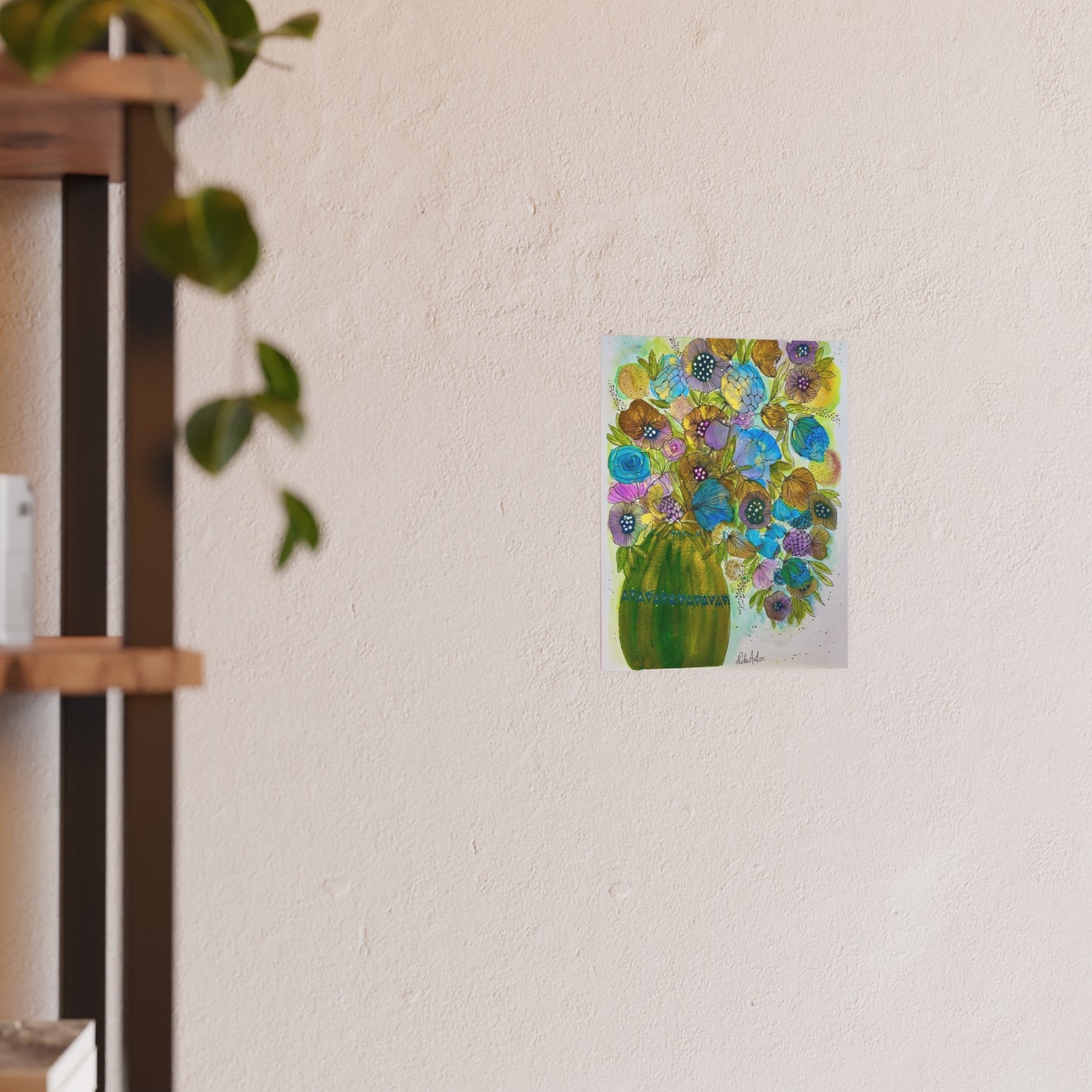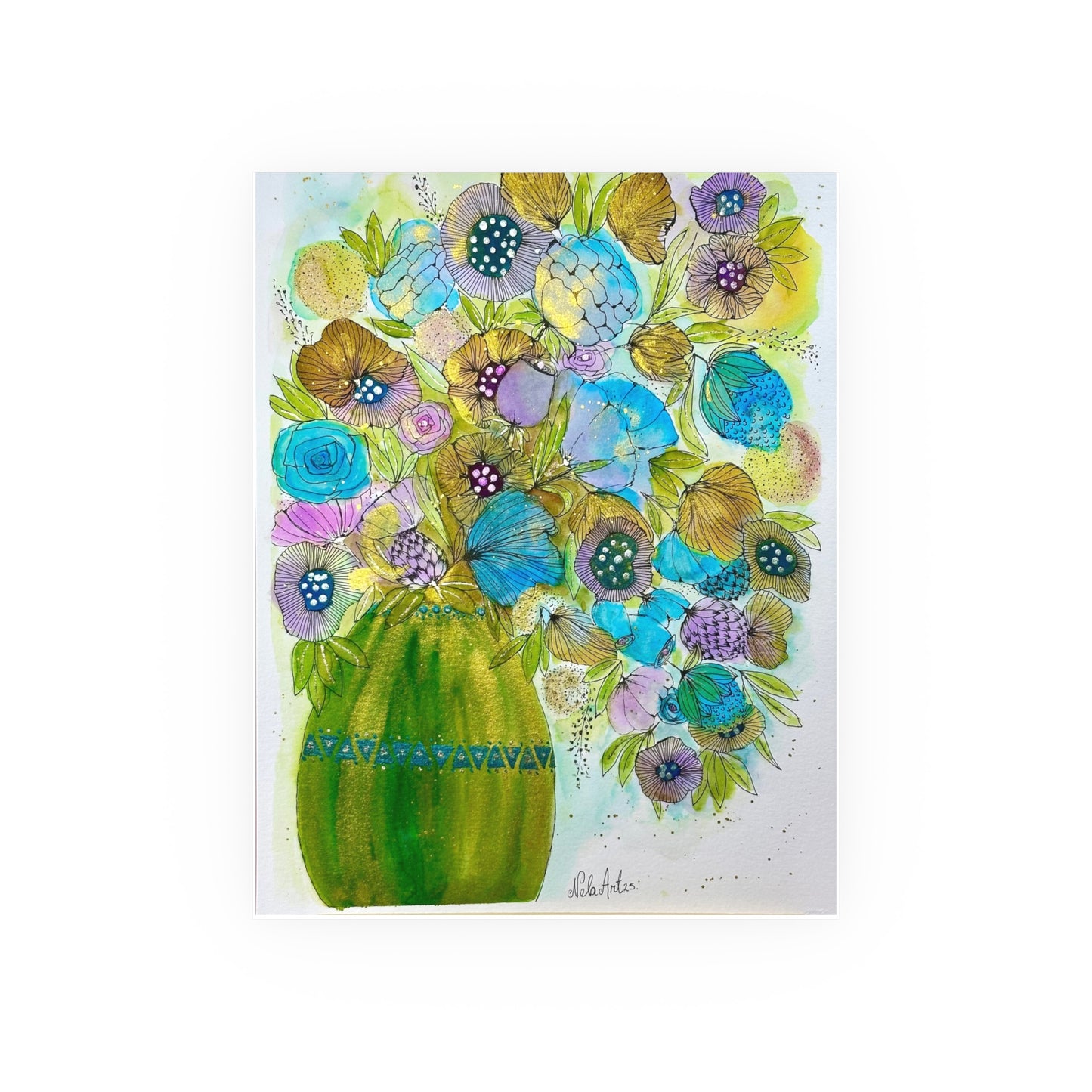 A luminous art print that brings a fresh burst of color into any room. Hand-painted florals bloom from a vibrant green vase, with teal, aqua, and golden petals layered in watercolor and ink for a lively, textured look. Choose a satin finish for bright, glossy tones that make the blues and greens sing, or archival matte for a soft, museum-quality surface that keeps the delicate brushwork and subtle details intact. Lightweight yet substantial, this poster arrives ready to frame or pin on a wall where it can lift a corner of your home, studio, or workspace with cheerful, painterly energy.